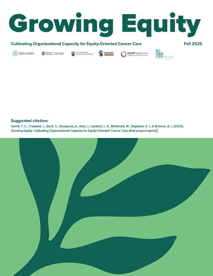 Horrill, T. C., Crawford, J., Beck, S., Bourgeois, A., Kaur, J., Lambert, L. K., McKenzie, M., Stajduhar, K. I., & Browne, A. J. (2025). Growing Equity: Cultivating Organizational Capacity for Equity-Oriented Cancer Care (final project report).